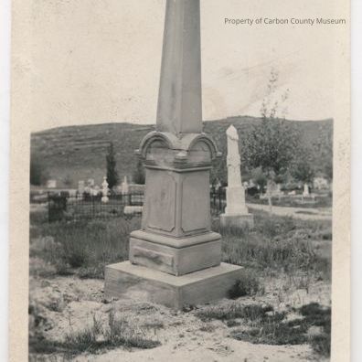 Black & white print of a grave marker. It is three tiered pillars with a spire shaped top. At mid section is relief arch carving above top pillar. Other markers can be seen behind in the distance.