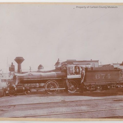 Update 2/2010: Black and white print attached to ivory matboard which has been irregularly cut down and one copy print. Image is of an early day train engine with cow catcher on front, high dimensional smoke stack on top and front of engine. Decorative wide ribbon is attached to engine sides and encircles the front and separate wrappings are around circular components on top of locomotive and the cab areas. The #674 is painted in white on lantern device at top front of engine and an U.S. Flat is attached to this component. The #674 is painted in large #'s on coal car side. Two men in uniform are standing on ground near train cabin. A man is at the cabin window and another man is standing on train between the cabin and the coal tender. Tracks are in foreground. Building tops are seen in background.
