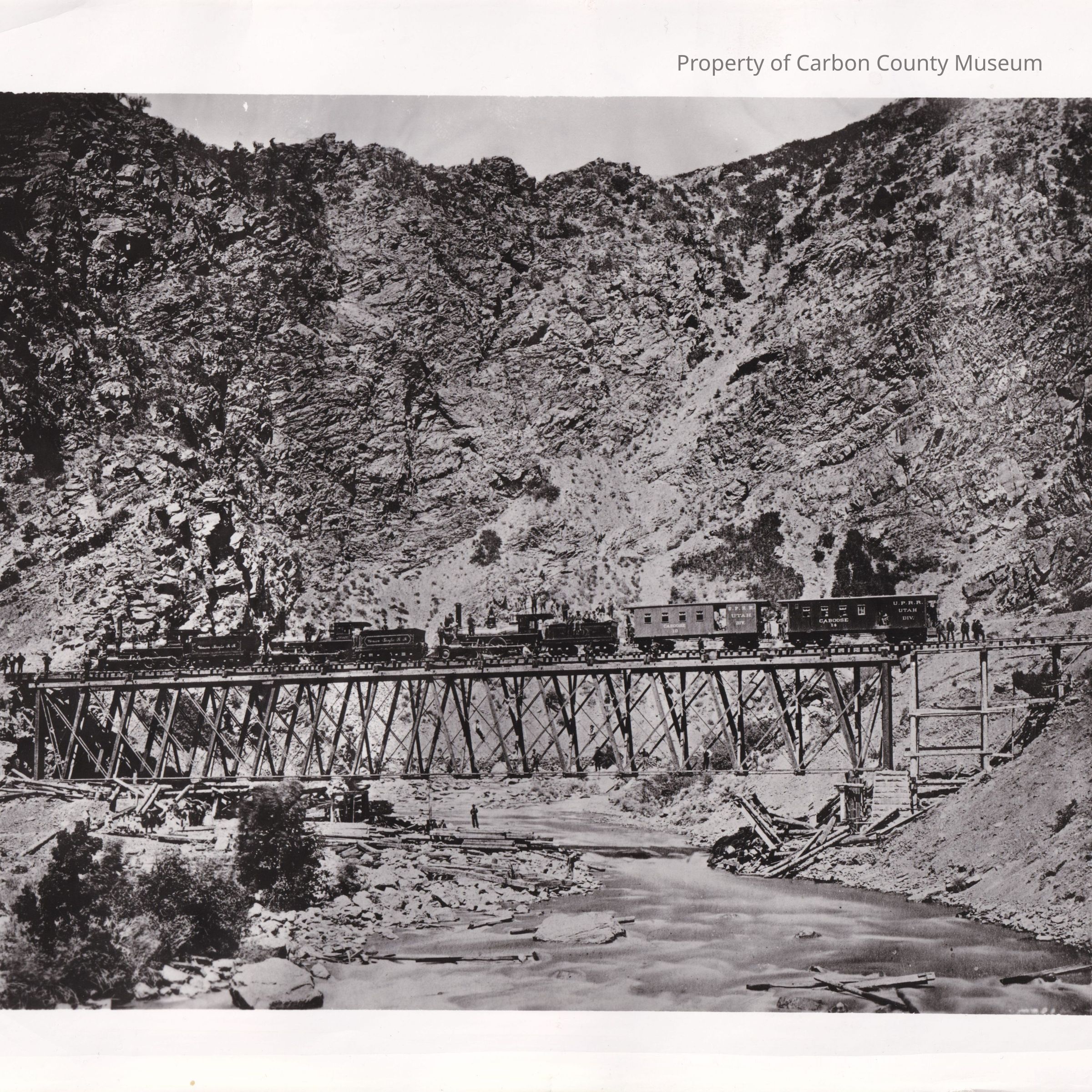 Update 2/2010: Black and white glossy print of two early day trains and attached cars crossing a river in a canyon on a high tressel bridge. High rock walls are in background. A group of men are standing on bridge at side left and at bridge side left. Other men are standing on various cars of the train and engine. Printed in white on some cars and caboose: "P.P. R.R. UTAH DIV." Cut logs and ties are strewn about on both sides of the river. Few shrubs are in foreground side left. Written on back in black ink: "Devils Gate Bridge. E.M.Tierney."