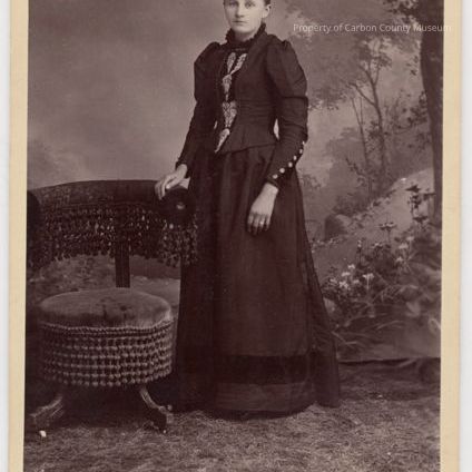 Black and white studio portrait on cream card. Image of a woman standing beside a stool with fringed back. An outdoor studio prop back drop is behind her . She is wearing a dark long dress with tear drop shaped lace pieces on a darker strip on bodice and around neck. Same dark cloth is around hem line of dress. The sleeves have buttons from cuff to elbow. her medium colored hair is curled on top and pulled back above ears. Printed on bottom: "Paramore Hawarden & Akron, Iowa."