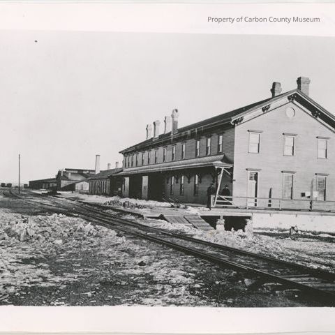 Update 2/2010: Black and white print original and one copy print. Image shows a very large two story rectangular building with many windows and multiple chimneys on rooftop. The building has a long horizontal awning running the length of the building attached below second floor windows. A railroad track bed is in foreground. Other buildings are seen in distance along the tracks. Rocky ground is at foreground side left.
