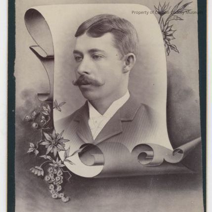 Black and white studio portrait on black mat. Image of a man facing toward photo left .His hair is parted on his left and combed down and his mustache is curled on ends . His suit is wide weave stripe texture with piping trim on lapel and collar. He wears a white shirt with light colored print tie. His image is inside an unrolled scroll with flowers on each side. Printed on the bottom in gold: "Brown Rawlins, Wyo."
