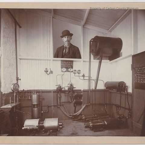 Update 2/2010: A black and white print attached to ivory colored matboard with gilt edges. Image shows a room with high white wooden walls and ceiling. The lower half of walls is dark wood. Multiple pieces of equipment, pipes, gauges are seen at top right of room mid range area, side left and floor. A large portrait of a man is attached to wall at center. The man in portrait is wearing a dark bowler hat and is wearing a dark 3 piece suit with colorful neck scarf. He has a dark mustache and dark eyes. Written on blackboard on side right wall in white chalk? is: "May 21, 1895", and a repair list follows.