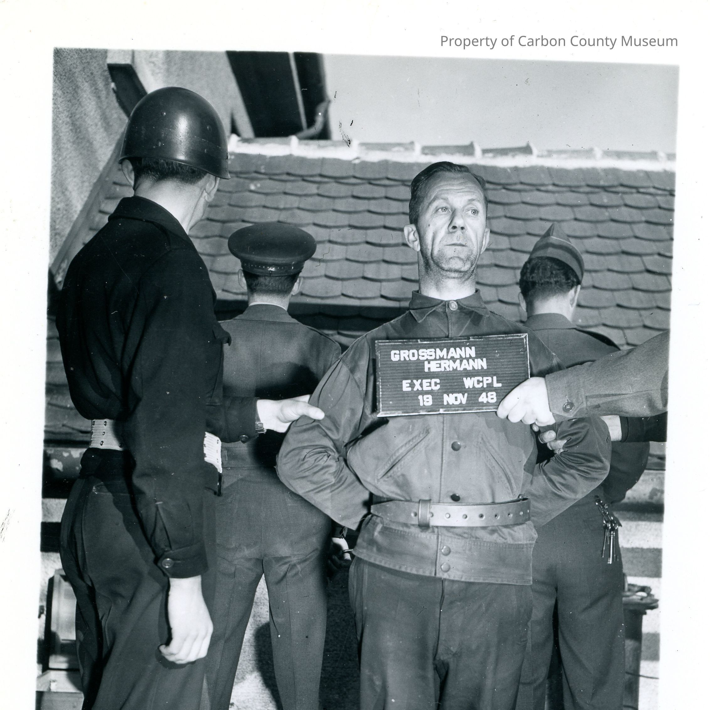 Black and white photograph of a man wearing a prisoner uniform. He is being held in place by a man wearing a military uniform facing away from the camera, a second man out of frame is also holding the prisoner in place. Behind the three are two men in military uniforms with their backs to the camera. In front of the prisoner a placard is held that reads "Grossmann Hermann EXEC WCPL 19 NOV 48".