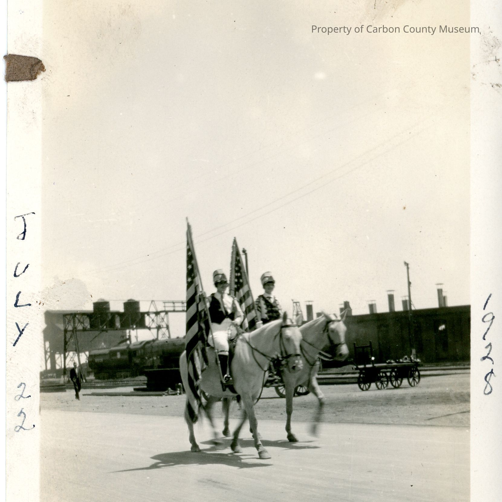 Black and white photograph. Two men in uniforms are riding two white horses on a paved street, they are carrying American flags. Train cars are visible in the background. Written along the top edge of the photograph is "RAWLINS", along the bottom "CHRISTY BROS. CIRCU PARADE", vertically along the left edge "JULY 22", vertically along the right edge "1928". Printed on the reverse is the number 22.Collection