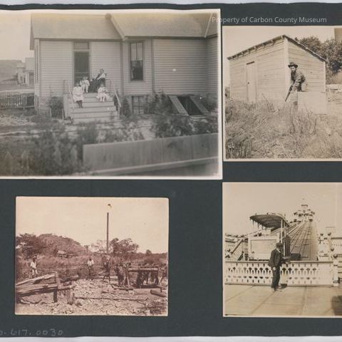 Written on back in black ink: Mrs. Hertzell & three nieces. She raised the girls. They were our neighbors in Rawlins, 1905. (See 1963.423.0001) Top right: man with his knee on a wood box with a saw in his right hand and a board in left hand. A wood shed is in the background. Bottom left: 10 black men working with pipes, thatched roof huts in background. Bottom right: Some sort of covered trolleys on inclined tracks surrounded by a decorative fence. Side 2: Top and bottom left and top right of a very wide, large waterfall with dense foliage on sides and beneath. Bottom right: A river with large piece of machinery being floated followed by men in a boat.