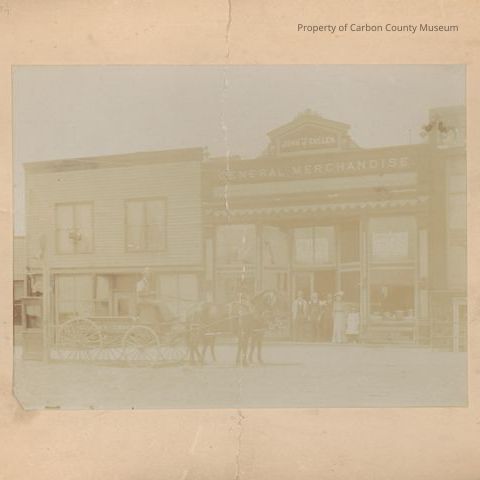 Update - 2009: Black & white print on cream colored mat. Dirt street & wagon with two horses harnessed setting in front of store & clapboard bldg. Sign on store reads: "John J. Cullen" "General merchandise". Printed on wagon"Cullen's Grocery". A man sits on wagon seat holding reins in his hand. There are three men, one woman & a child in entrance to store.