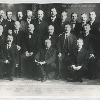 Black and white print of 21 well dressed men standing and sitting in 3 rows, 9 of them have mustaches . Printed in black on the bottom: "Wm Keating Electrician, V.H. Stovel, Machine shop; A. A. Underwood, Scrap Platform; J. L. Jonlas, Wheel Shop; Jas. Fink, Asst. Mill; Chas. Finlayson, Gen. Car; A. C. Kingsford, Div. Storekeeper; S.A. Moore, Erecting Shop; Chas. E. Weeks, Repair Gang; C.H. Hawkesworth, Paint Shop; L.W. Davis, Asst. Car; Wm. Dodson, Road Gang; L.E. Brubaker, Air Room; E. F. Fay, Supt. Shops; Wm. Niland, Master Mechanic; A. Roesch, Gen. Foreman; E.R. Chapman, Boiler Shop; R. E. McCabe, Round House; John Sorenson, Tank Shop; McCabe, John, Tin Shop; M.C. Dugan, Blacksmith Shop.