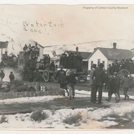 Update -2009: Black & white copy print. Snapshot. Image of a parade with wagons with lots of men riding in them. Wagon appear to be drawn by a steam engine & are moving from right to left. Spectators standing on side of road in foreground. Yard in foreground left filled with wooden barrels. Houses /buildings in background. Snow on ground. Snow hill in background. Sign on building at front of procession: "Cliff House".