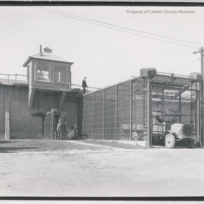 Black and white contact print of car lock at old Wyoming State Penitentiary. Barred large entry built adjacent to wall. A vintage truck is coming out overhead door gate. Guard tower is on wall above walk -in door which is also barred and built adjacent to wall. A hose reel is next to door.