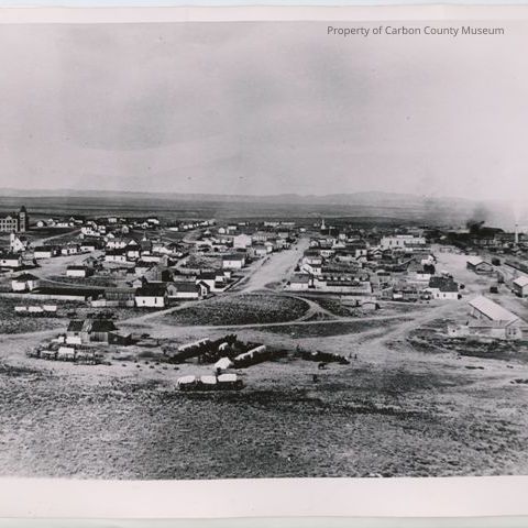 Rawlins, taken after 1884 and before 1890. Image from elevation of a town laid out on the prairie. Mountains/hills in background. Railway yard at right side. Freighting concern at center foreground - rows of wagons in open area by frame building. Probably taken from Monument Hill, facing to the east.