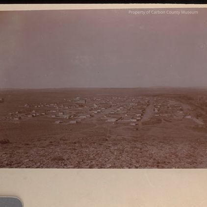 Update - 2009: Sepia print. Snapshot. Mounted on tan matboard. Image from elevation of a town laid out on the prairie. Mountain/hills in background. Railway yard at right. Several multi-story buildings in center. Large multi-story building visible at left edge.