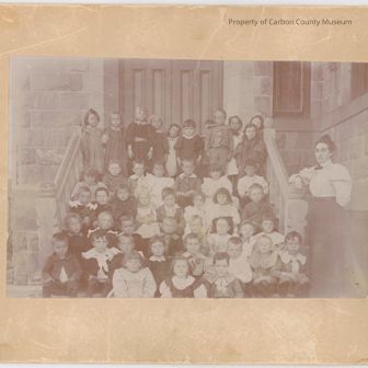 A black and white print attached to an ivory colored matboard. Image shows an informal 7 row grouping of a young age school class sitting and standing on the front steps of a sandstone school building. Large, dark double doors are closed at the top of the stars. A teacher wearing a long dark skirt and a white blouse with puffy sleeves is standing by the banister with her right arm resting on the pilaster knob.