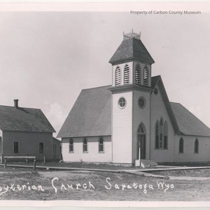 Update - January 2010: Black & white print depicting a white wooden structure with a high pitched roof at two angles. The building has a large tower with bell tower at top. This tower roof is shingled as the building roof. An open square decorative rail is seen at the top of the bell tower. There are multiple windows & most have a square pane at lower level & a half oval window above the square. A small white frame house with a roofed, open front porch is at side left. Printed on lower edge of print from the negative: Presbyterian Church Saratoga, Wyo Gleason Photo.