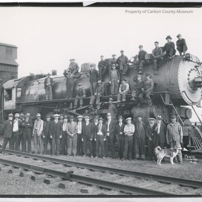 Black and white glossy print of a large steam locomotive. It is identified with metal placards as "#7021" engine. Standing on the ground beside the engine are 21 men and a dog. Sitting on the top are 9 more men. One man leans out the window of the engineers compartment. Another set of tracks is in foreground. An over the tracks structure is on photo left. Printed in white on original negative: "Meyers Photo-27".