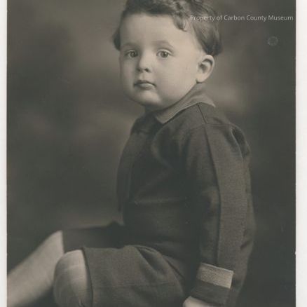 Update - January 2010: Black & white studio portrait of a young boy seated on a chair? with his left leg tucked under his extended right leg. He is wearing a matching dark shirt with lighter colored collar & sleeve hand at lower edge & short pants with light colored textured socks. His hair is medium colored & wavy at the top.