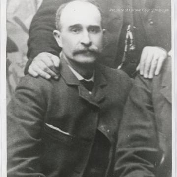 Black and white glossy print of a man wearing a dark heavy jacket. he has a mustache and receding hair line . There is a hand on his right shoulder from the man standing behind him, who is not seen. Another man not see except for his shoulder and arm also has a hand on his shoulder.r This is an enlargement from another print (1977.579.0004) to show Sheriff James G. Rankin. Written on back in pencil: "Sheriff Rankin 1884-1885." In black ink: "James G-- Sheriff at time of Big Nose Georges Trial." In pencil: "Died 1911". In blue ink: "People-17. Catalog #217."