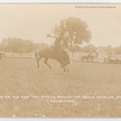 Update 5/2010: Black and white print card of a man on a bucking bronc. On photo left is another man on a horse, probably a pickup rider. In background is a fence and chutes. Men and horses are in front and a sign with a "3" on the top of fence is about them. to the right is a "4" about fence. Bucking horse has his head down and feet in the air. Rider has his right arm flung back and has lost his hat. Printed on bottom in white on original negative: "Mason on Tip Top Tri State Round-up. Belle Fourche, So. Dak. (Double Day)."