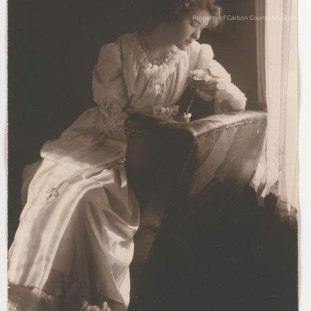 Update - January 2010: Black & white print of a young woman wearing a long white dress which has a ruffled neckline, full puffed sleeves with lace & bow trim at elbow. The woman is seated on side left arm of a chair with her legs to front & her torso turned to left & her left elbow propped on the high back of an upholstered chair. She is holding a flower in her right hand & touching the bloom with her left as she gazes downward at the flower.