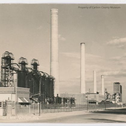 Update 5/2010: Two black and white print cards of the Sinclair Refinery. Image of 4 large smoke stacks, a series of tanks with metal framing behind them, and large hoses running between on the top. A brick flat top building inside a fence with gated entry between brick pillars is in foreground. In the distance are other tall metal structures. A street runs along the side on photo right. Printed in white on original negative: "Sanborn Y 1071". Printed on back in black: "Post Card" "Correspondence" "Address". A dashed square with " Place Stamp Here" inside, in black in: '1937".