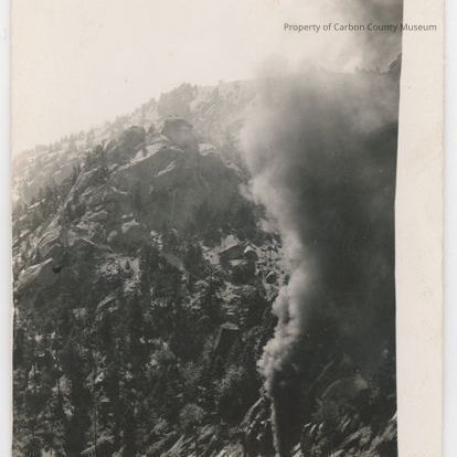Update 5/2010: Black and white print card of a donkey steam locomotive and passenger car on railroad tracks next to rocky hill. Smoke is rising to the top of the hill. Donkey engines are used for narrow gauge mountain tracks. Engine sets higher behind for maneuvering steep grades. Printed on back: "Post Card" "Correspondence Here" "Name and Address Here". "AZO" and a triangle in repeating pattern around "Place Stamp Here".
