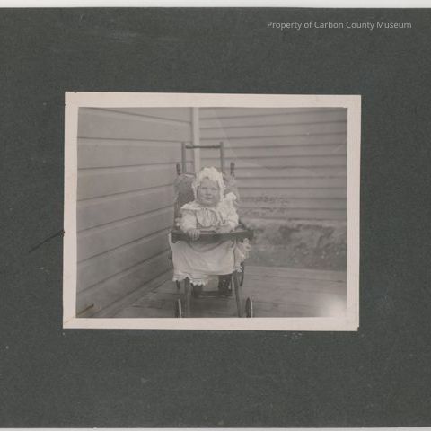 Update - 2009: Black & white print. snapshot. Mounted on dark grey matboard. Image of an infant in a wooden stroller. Stroller has tray on front & pillow behind child. Child is dressed in white dress & bonnet, dark tights & patten leather shoes. Stroller is sitting on wood porch (?) with wooden house walls at left & in background.