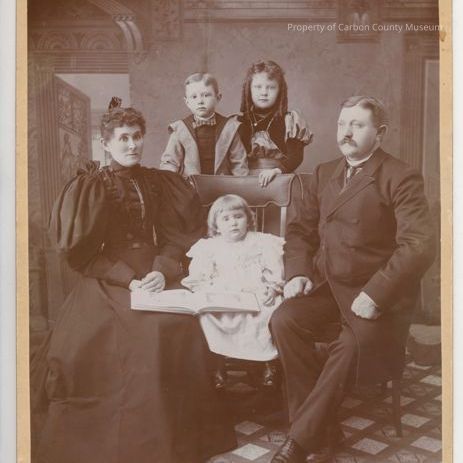 Update - January 2010: Black & white studio portrait print attached to ivory colored matboard with gilt edges. Image shows a family group with a woman dressed in dark long dress with leg o' mutton long sleeves & high neck, seated in a chair on photo left. A young child dressed in white long sleeve dress is seated in a chair center between woman & a man with a mustache wearing a dark suit & dark tie. His suit jacket is very long. A young boy & girl are standing behind the seated child. The girl on back right has dark hair in long ringlets. Ornate studio ceiling border & doorway are seen in background. Floor appears to be patterned linoleum. The woman & child are holding a single opened large book in their laps.