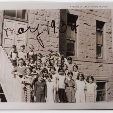 Black and white contact print of a class of students on steps of school. Approximately 30 children in rows up the steps to a stone building. Wood sides are on both sides of steps leading to double wood doors. Written in black across photo top: "May 1934".