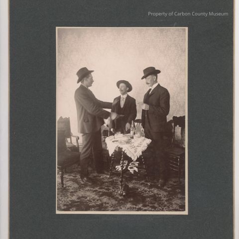 Update - January 2010: Black & white print attached to dark grey matboard. Image is of three men wearing three piece suits & hats standing around a small dark spindle leg table which is covered with a white decorated tablecloth with border fringe. The table has a standing liquor bottle & glasses & a turned over liquor bottle & turned over glass. The men on side left & right are holding cards in their hands & the man in the middle is looking at the man side left who has his left are on him. A dark & light foliage design carpet is at foreground with chairs at side left & right.