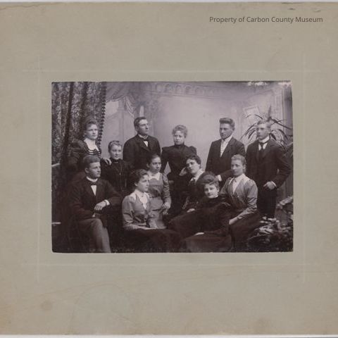Update - January 2010: Black & white studio portrait print affixed to light grey matboard. Image shows a group of posed (3) men and women (8) seated & standing. Women have their hair in updos & most are wearing dark long sleeve dresses; two of the women have on matching lighter colored blouses with white insets at neck bodice & shoulder. Men area wearing dark jackets & narrow type of ties. A floral drape with ball fringes at side left & a faded mural appears in background. there is an arrow on image pointing to a man at center back: John Swanson is written in blue ink.