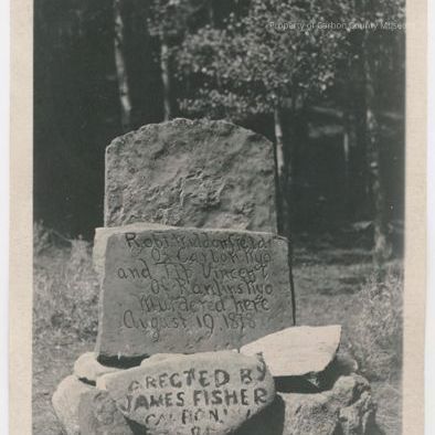 Black and white print of stone memorial monument. A series of large rocks is the base on which 3 more are laying upright vertically. Engraved on middle upright stone: "Robt. Widdowfield of Carbon, Wyo and Tip Vincent of Rawlins, Wyo murdered here August 19, 1878." On bottom upright stone: "Erected by James Fisher Carbon Wy 1890(?)".