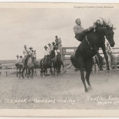 Written on original negative across bottom: "Bob Pennock-Bareback Riding-Rawlins Rodeo. Meyers Photo."