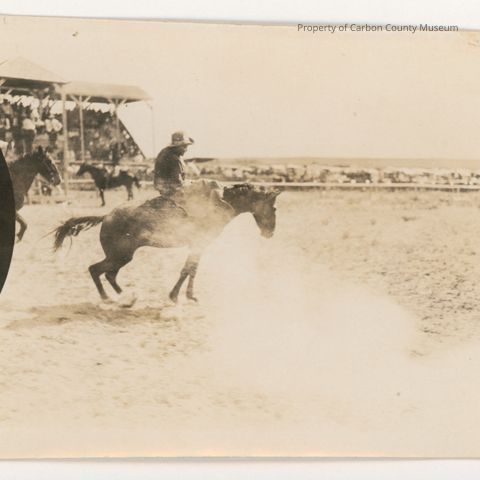 Update 2008: Black and white print. Snapshot .Image of a cowboy on a bucking horse in an arena. Lot full of cars and spectator-filled grandstand in background. Another horse at left side. Black half circle photographic anomaly at center left side. Light swath through center to lower right corner.