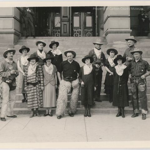 Black and white glossy print of a group of men and women dressed in western and cowboy clothing standing on the steps of the Wyoming State Capital Building. Man in first row on extreme left has chaps and six shooter in holster with cartridge belt. he has cowboy kerchief around his neck and knotted in front. He is wearing a light colored hat tilted back on his head. His hands are holding an object with a circular tag . A man in the middle of the front row is wearing Angora chaps, and man on right front row has on leather chaps with a pocket on the front of each leg at thigh heighth. All the men and women are wearing hats . On upper tier of portico a woman with a child is standing in the corner. Standing on right side of back row is W.W. Daley with his shirt collar elevated and a tie around his collar at neck edge which is tucked into his shirt. He is holding a cigarette in his left hand.