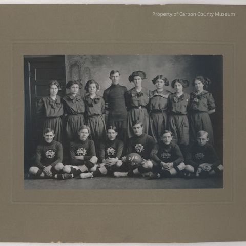 Girls' Basketball Team, Rawlins, 1911. Helen McMicken, Leta Alcorn, Hazel Anderson, Rachel Chapman, Ross Alcorn, Roxie Vivian, Mary Mahoney, Esther Clause.