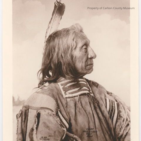 Black and white print of Native American Chief. he is wearing a leather beaded quilled pullover shirt with leather braided fringe. A feather sticks above his straight, shoulder length hair. He is elderly and his hair is greying in front. His face in wrinkled and he has a strong nose. His right profile is shown. Printed on the bottom: "@1898 F.A. Rinehart Omaha". "Chief Red Cloud, Sioux No. 45".