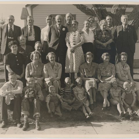 Written on back in blue ink: "Chris and Maren Jensens Golden Wedding April 25, 1946". "Peter Andersen, Charlie Rasmussen, Martin Petersen, Chris B. Jensen, Lawrence Jensen, Maren Jensen (Mrs. C.B), Marie Rasmussen, Joyce (Mrs. Jim) Jensen, Gertrude (Mrs. Soren) Jensen, Soren Jensen, Mildred (Midge-Mrs. Walter) Jensen, Laura Jensen Peterson (Mrs. Martin Peterson), Alma Andersen, Walter Jensen, Christie Jensen (Mrs. Wm. Humphrey) Humphrey, Marguerite Jensen Reipl, Ruth (Mrs. Lawrence) Jensen, Mildred Jensen (Mrs. Earl Lewis) Lewis, William R. Humphrey (Christels) Dean Jensen (Walters), David Peterson (Lauras) William Reipl Jr. (Marys) Rogene Reipl, Marin Lewis, Bob Peterson, Deceased Clarence, Russell, Jim" Written in pencil: "April 25, 1946" Also names under or beside ink writing.