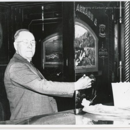 Two black and white copy prints of a man holding his hand on a safe handle. He has a receding hair line, wears a suit and glasses. Safe has picture painted on doors of mountain scene. He is holding a door open with his right hand. Written on back in pencil: "Theophil Kazmerchak 1886-1961 Watch Maker and owner of Kazmerchak Jewelry". Judge Merrell's safe.