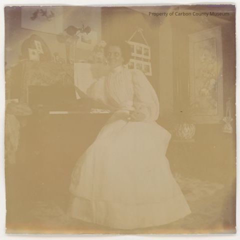 Update 2009: Black and white print. Snapshot. Made from Jungquist glass plate negative. Image of a woman in a long white dress sitting at a piano with what appears to be apiece of music in her hands. Potted plant on stand behind her. Walls profusely decorated with pictures.