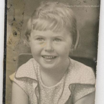 Black and white print of young girl. She is wearing a print dress with large flat collar. Her hair is light colored with bangs. Written on back in blue ink: "Shirley Rose Sears. Age 4 years. Weight 43 lbs."