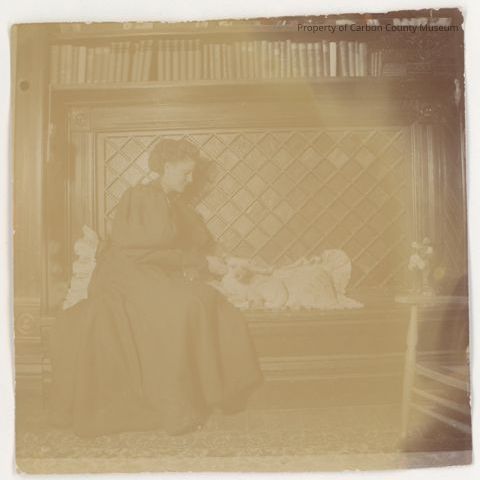 Update 2009: Black and white print. Snapshot. Made from Jungquist glass plate negative . Image of a woman in a dark dress with long skirt and leg-of-mutton long sleeves. She is seated on a bench seat with a small dog and ruffled pillows.Seat is backed by high wooden panel with diamond shapes across center. Book shelf with books above. Chair in foreground right, patterned carpet.