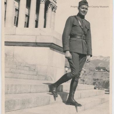 Black and white print of a young man in military uniform on massive steps of a large building. Uniform is dark with belted waist overcoat, dark slacks, tall lace up boots, and soft sided hat. A strap is across shoulder through shoulder epaulet. building has large columns with decorative tops below a decorative eave. In distance are buildings and mountains.