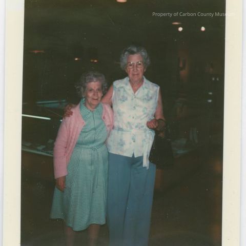 Color snapshot print of two elderly women. Woman on left has on blue print dress and a pink sweater. The woman o right has on blue slacks and print sleeveless blouse. She has a purse hanging form her left arm and is taller than the woman on the left.