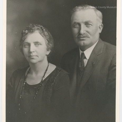 Black and white studio print of a man and woman. He is wearing a dark, 3 piece suit, tie and white shirt. He has a lapel pin on his left jacket lapel. he has a mustache, greying hair parted on his left. She is wearing a dark dress with rounded neck and no collar. The dress has decorative trim on bodice and around neckline. She wears a beaded long necklace and has short curly hair.