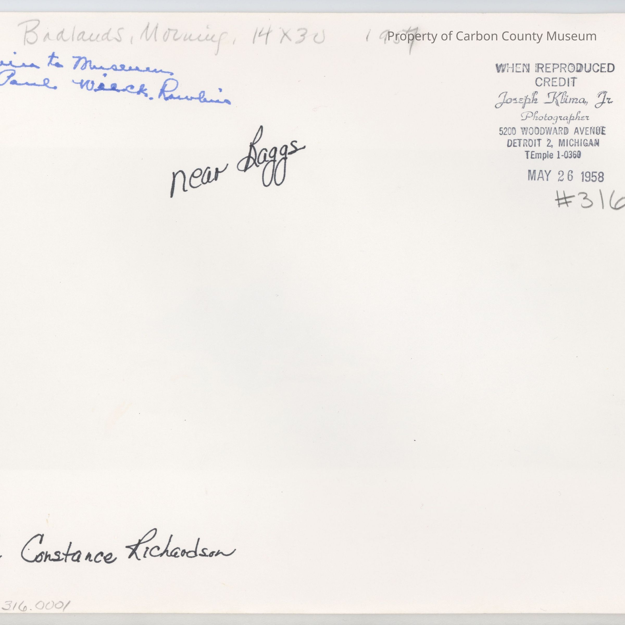 Written on back in pencil: "Badlands Morning 14 x 30 1957:" Black ink: "Near Baggs" "By Constance Richardson."