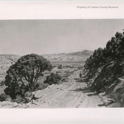 Update 3/2010: Black and white print. Image of a painting of a dirt road following a canyon. Bluffs on either side and in the background. Trees along road in foreground. Horseback rider on road. Signature of artist with date in lower left.