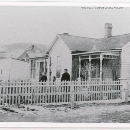 Black and white copy print of a house on 7th street. House is clapboard with an open side, covered porch that has three decorative posts and spindles under roof edge. Standing in the yard is a woman and 2 children. The yard has a picket fence with gate between 2 posts on photo right. Houses are in background on photo left.