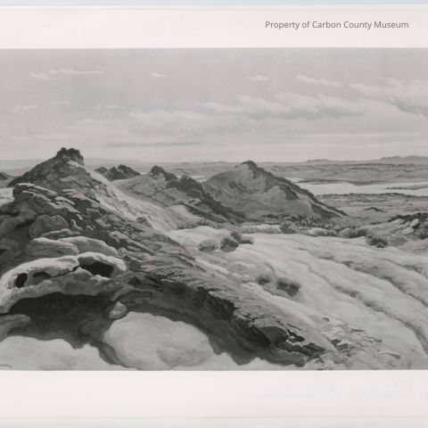 Written on back in pencil: "22 x 32 Wyoming Desert 1957" "Sold to Mr. & Mrs. Lawrence Fleischman Detroit". In black ink: "Along road to Seminoe Dam." "By Constance Richardson."