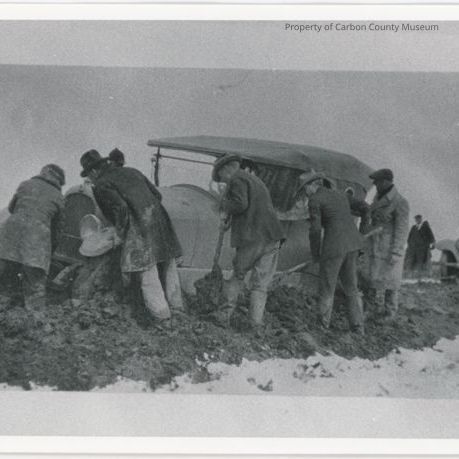 Black and white copy print of a vintage car that is stuck in the mud up to the axles. Seven men are around the car with shovels or lifting the car. Their feet are in much. They have on long coats, jackets and hats. Another car is parked behind the stuck one. What could be snow is on the edges of the road.