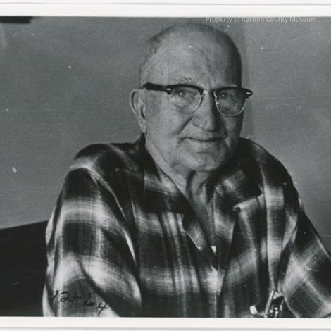Black and white print of an elderly man. He is wearing a plaid shirt with a pocket protector full of pens. He has glasses with black bows and top front and wire under the lens. He has short, thinning hair. Written on bottom in black on original: "12-64". Written on back in pencil: "Chris Larsen:.
